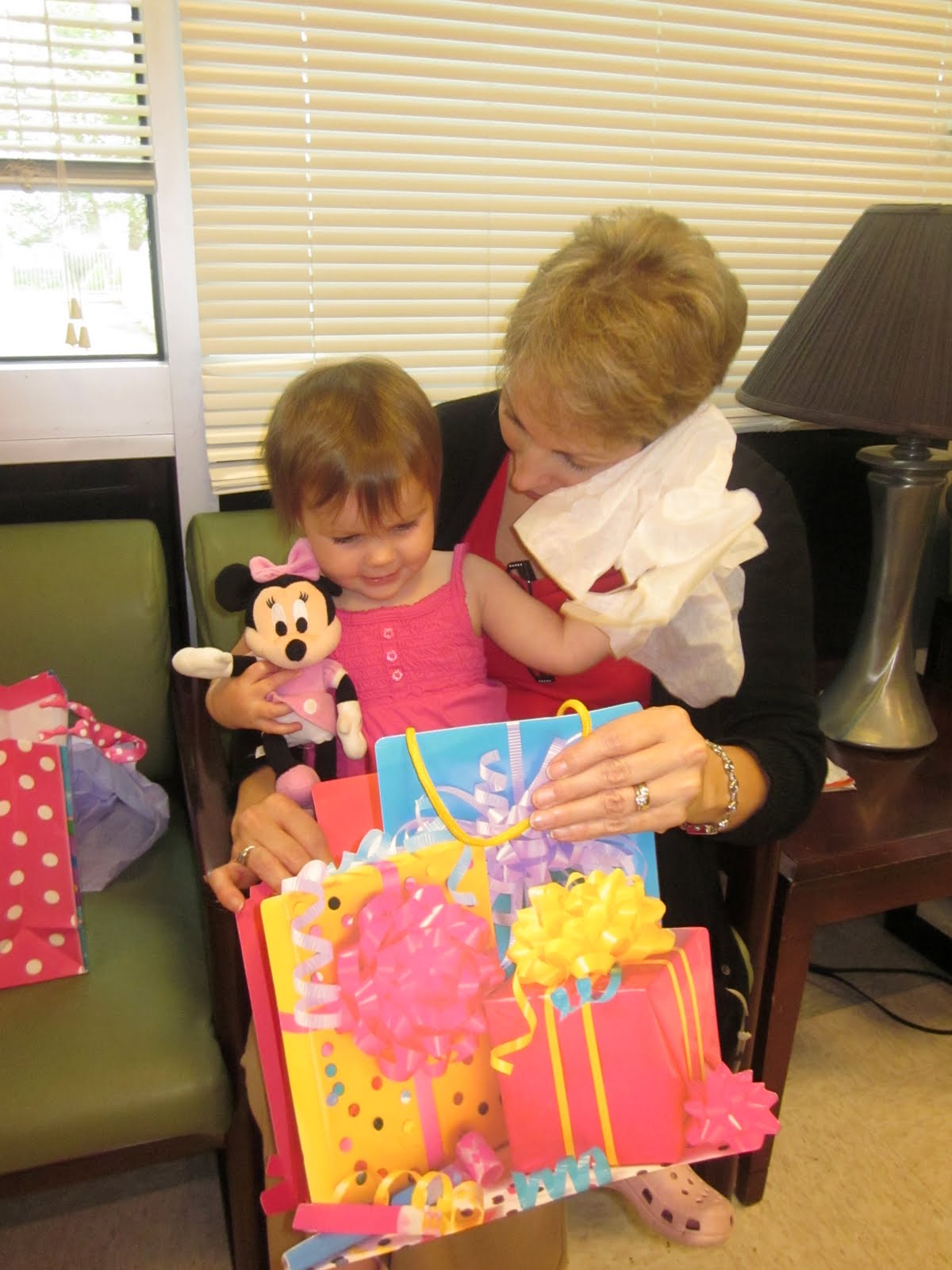 Opening some birthday presents. We gave her a polka dot piggy bank and a Bama tshirt. Uncle Russell and Aunt Nan gave her a puppy pillow pet.