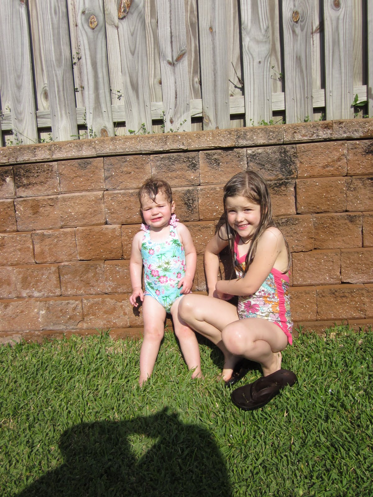 Daisy and Avery about to come in. Mel had just gotten some hand me downs and had an 18 month bathing suit for Avery to wear. It was so small but that girl was grunting to get her little arms in it.